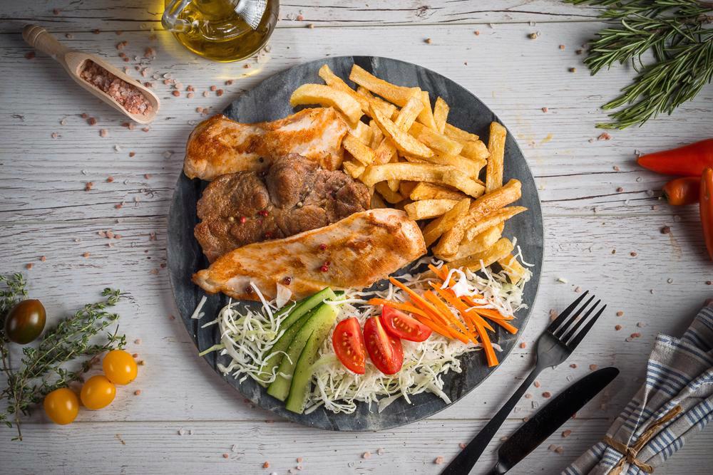 Ingredients: 1 pc. Pork neck, 2 pcs. Chicken breast, fried potatoes or rice with vegetables, cabbage salad, choice sauce, juice or beer 650g