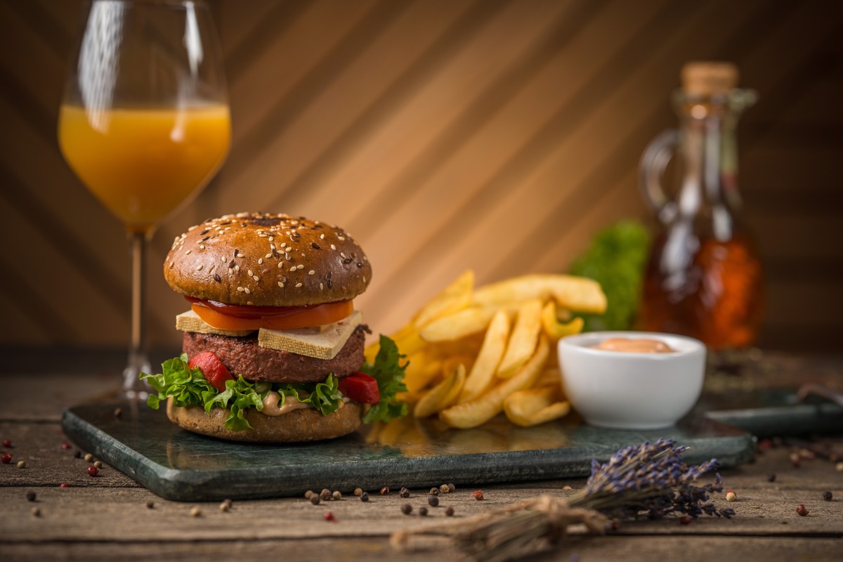 1x Burger "Sensational Vegan Burger" 1x Portie Cartofi Fry dip (150g) 1x Sos la Alegere (70g) 1x Bautura Racoritoare / Bere Tuborg 0.5l